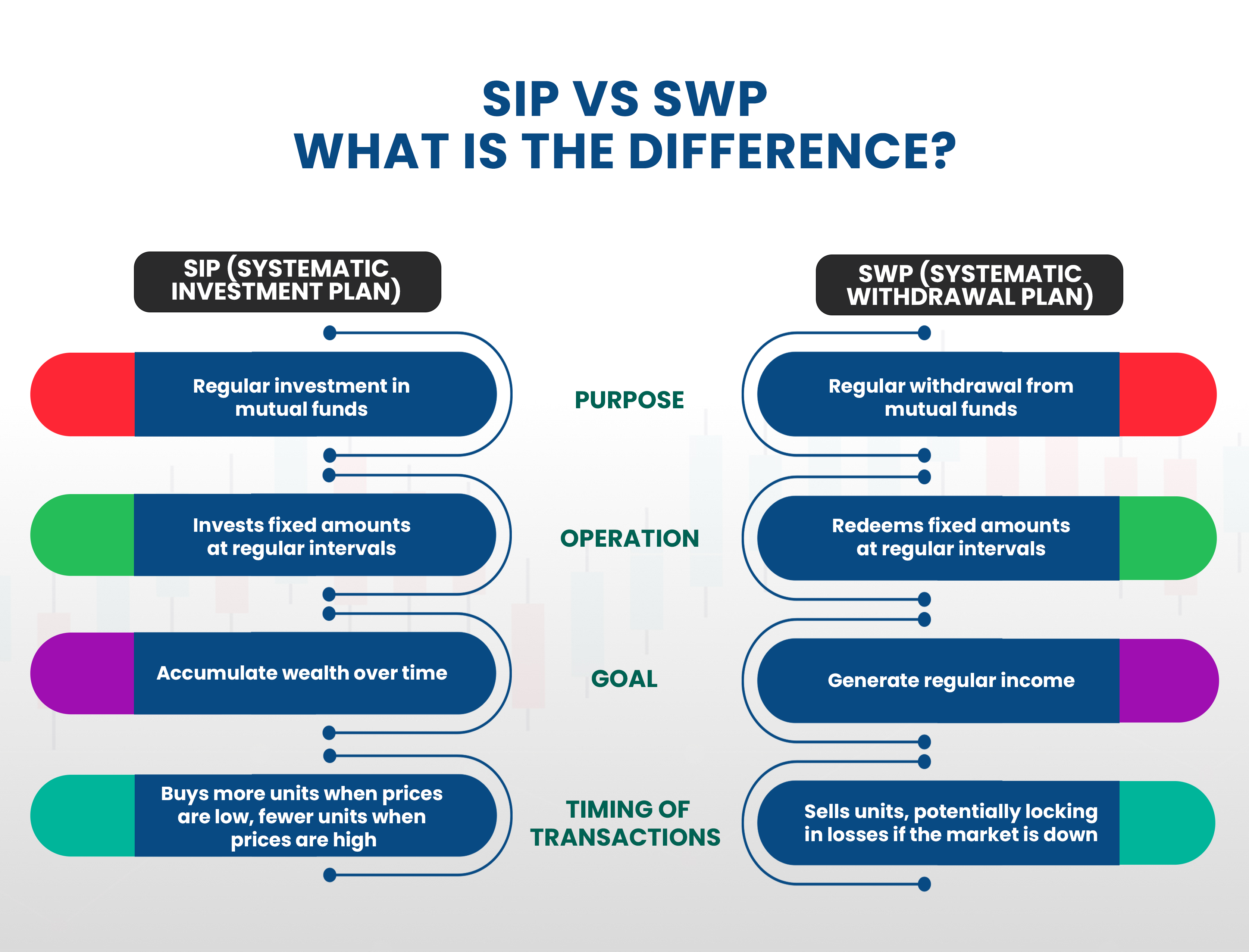 SIP निवेश का संग्रहण करता है, जबकि SWP निवेश की नियमित निकासी के लिए है। SIP निवेशक धनराशि जमा करते हैं, लेकिन SWP निवेशक नियमित आय अर्जित करते हैं।
