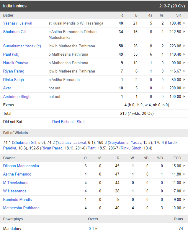 भारत की पारी की शुरुआत शुभमन गिल और यशस्वी जायसवाल ने की। दोनों बल्लेबाजों ने तेज़ शुरुआत दी और श्रीलंकाई गेंदबाजों पर दबाव बनाए रखा। सूर्यकुमार यादव और रिंकू सिंह ने भी महत्वपूर्ण रन जोड़े और टीम को मजबूत स्थिति में पहुँचाया।
