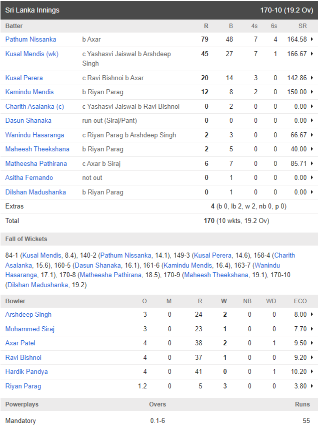 भारतीय गेंदबाजों ने भी शानदार प्रदर्शन किया। अर्शदीप सिंह और मोहम्मद सिराज ने शुरुआती विकेट लेकर श्रीलंका की रफ्तार को धीमा किया। रवि बिश्नोई और अक्षर पटेल ने भी महत्वपूर्ण ओवर फेंके और रन गति को नियंत्रित रखा।